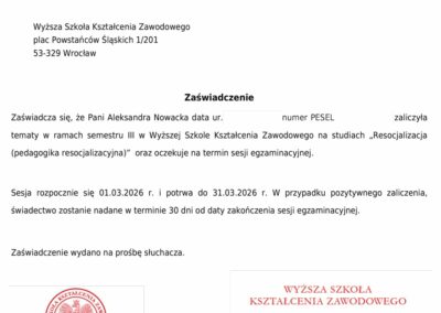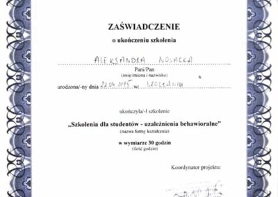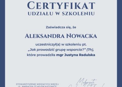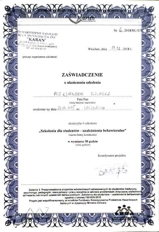 Odbyła staż terapeutyczny w grupach osób współuzależnionych oraz uzależnionych od alkoholu przy Sycowskim Punkcie Konsultacyjnym AA.