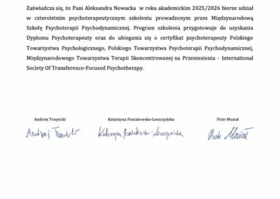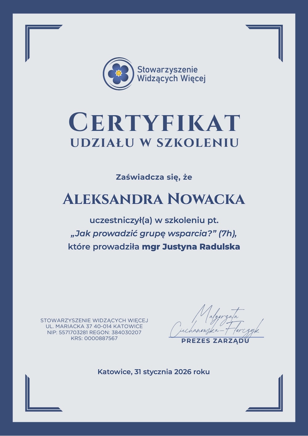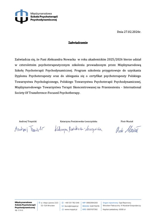 Pani Aleksandra jest świetnym psychoterapeutą i bardzo sympatyczna, życzliwą osobą. Dzięki terapii odzyskałam wewnętrzny spokój i stałam się szczęśliwym człowiekiem. Jest osobą bardzo kompetentną.