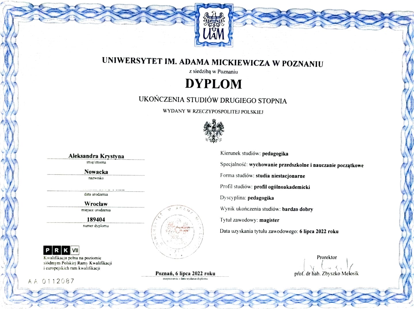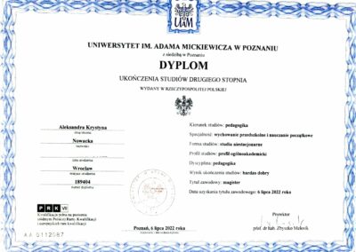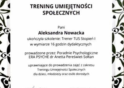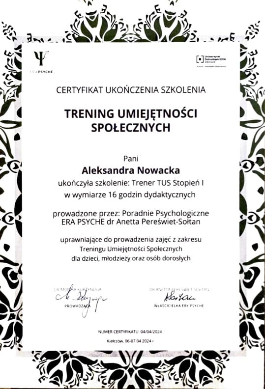 Certyfikowany Trener Umiejętności Społecznych, nauczycielka z wieloletnim doświadczeniem w pracy z dziećmi oraz ich rodzinami. Obecnie kształci się w Międzynarodowej Szkole Psychoterapii Psychodynamicznej we Wrocławiu.