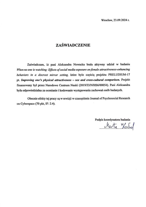 Bardzo polecam Panią Aleksandrę, dzięki niej zaczynam lepiej rozumieć siebie i to co dzieje się w mojej głowie. Na każdej wizycie czuje duży komfort, bezpieczeństwo i bijącą sympatie od Pani Oli.