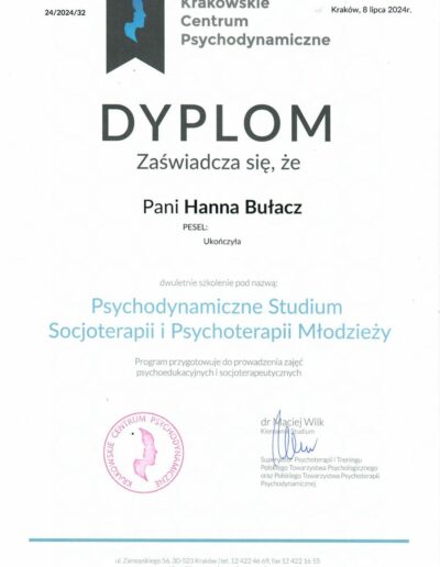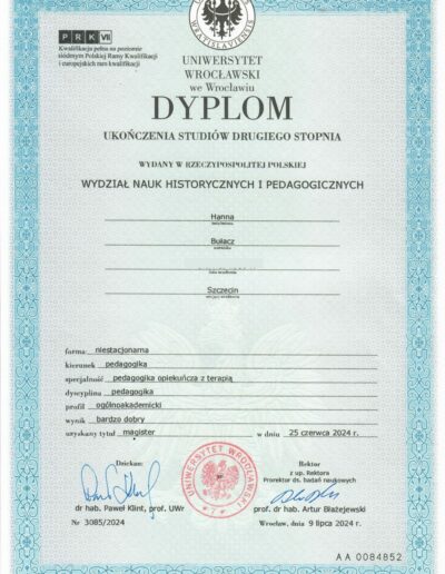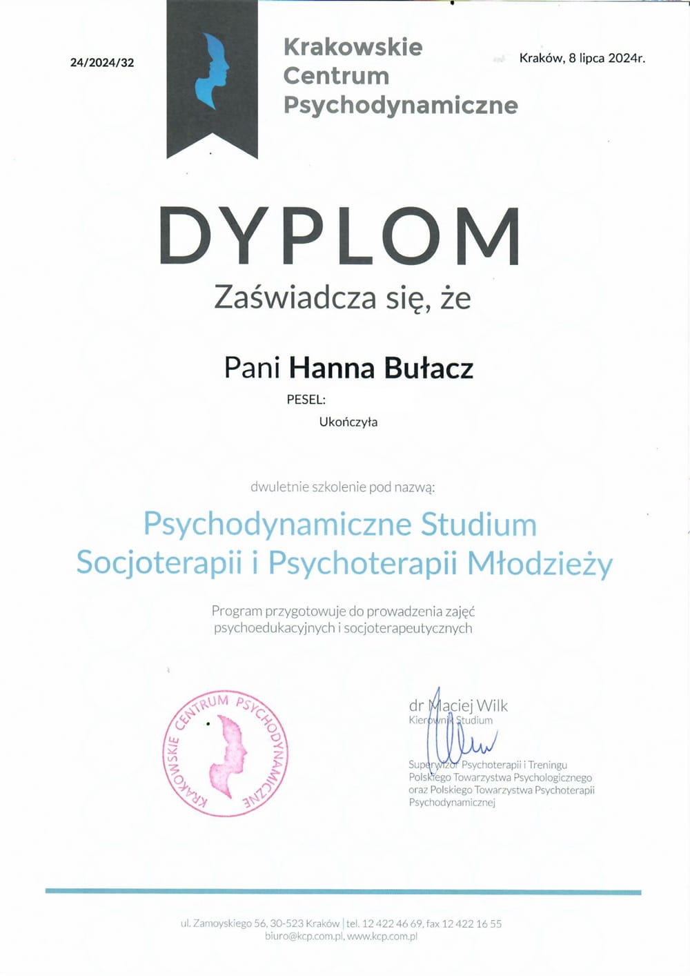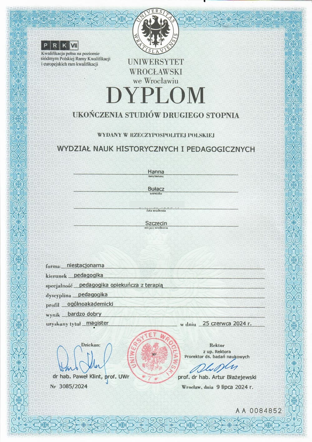 Ukończyłam Psychodynamiczne Studium Socjoterapii i Psychoterapii Młodzieży w Krakowskim Centrum Psychodynamicznym oraz studia na kierunku Pedagogika Opiekuńcza z Terapią na Uniwersytecie Wrocławskim.