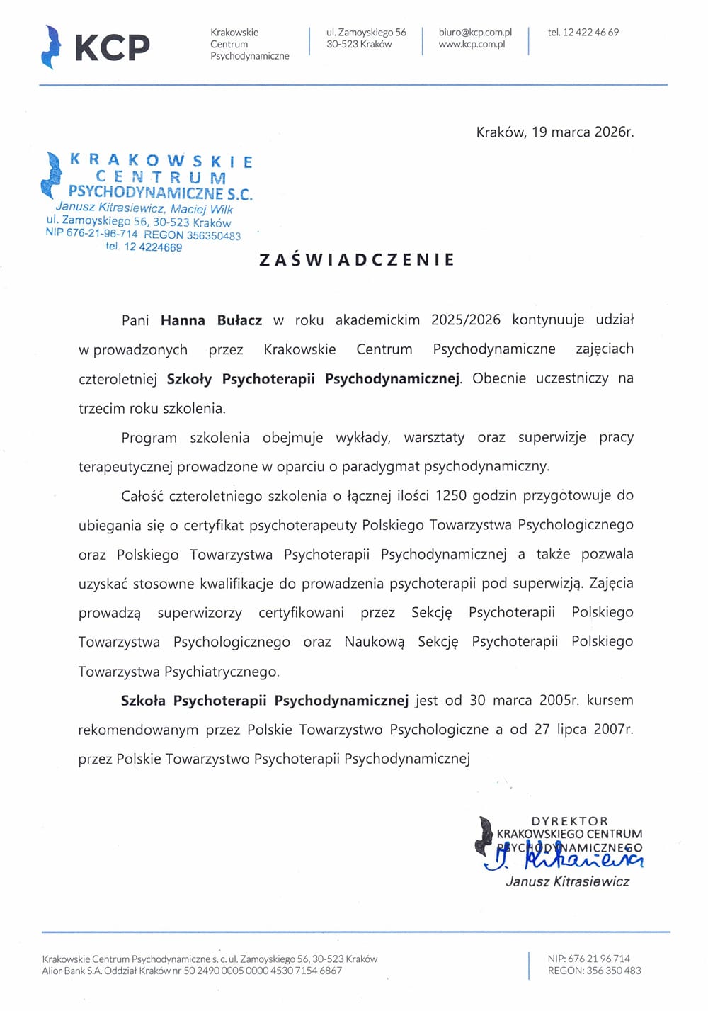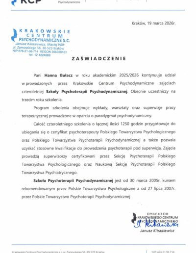 Byłam na konsultacji u Pani Hanna Bułacz. Bardzo empatyczna, profesjonalna psychoterapeutka. Czułam zrozumienie i brak oceny jeśli chodzi o moje problemy. Zdecydowałam się na psychoterapię, nie mogę się doczekać kolejnych wizyt.