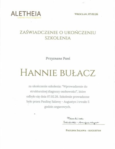 Pani Hanna Bułacz naprawdę wykazała się profesjonalizmem. Przeprowadziła bardzo obszerny wywiad, słuchała o moich problem, czuła że jest nimi zainteresowana. Polecam A.